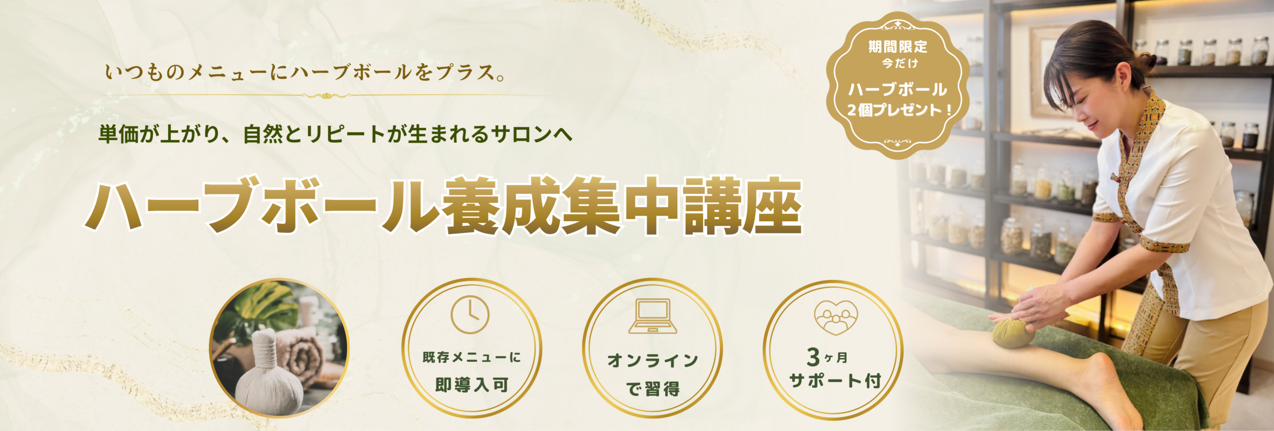 長年の修行は不要。初心者でもすぐに取り入れられるのがハーブボールの特徴です。学んですぐ現場で使える内容なので、受講後すぐに自信を持ってメニュー化できます。