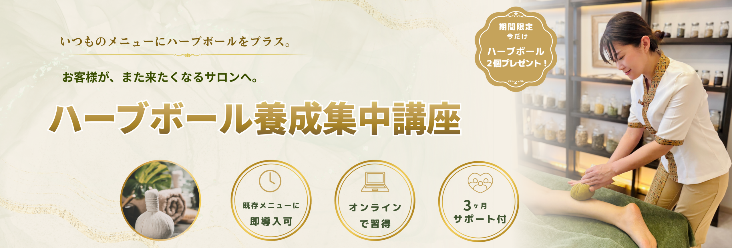 長年の修行は不要。初心者でもすぐに取り入れられるのがハーブボールの特徴です。学んですぐ現場で使える内容なので、受講後すぐに自信を持ってメニュー化できます。